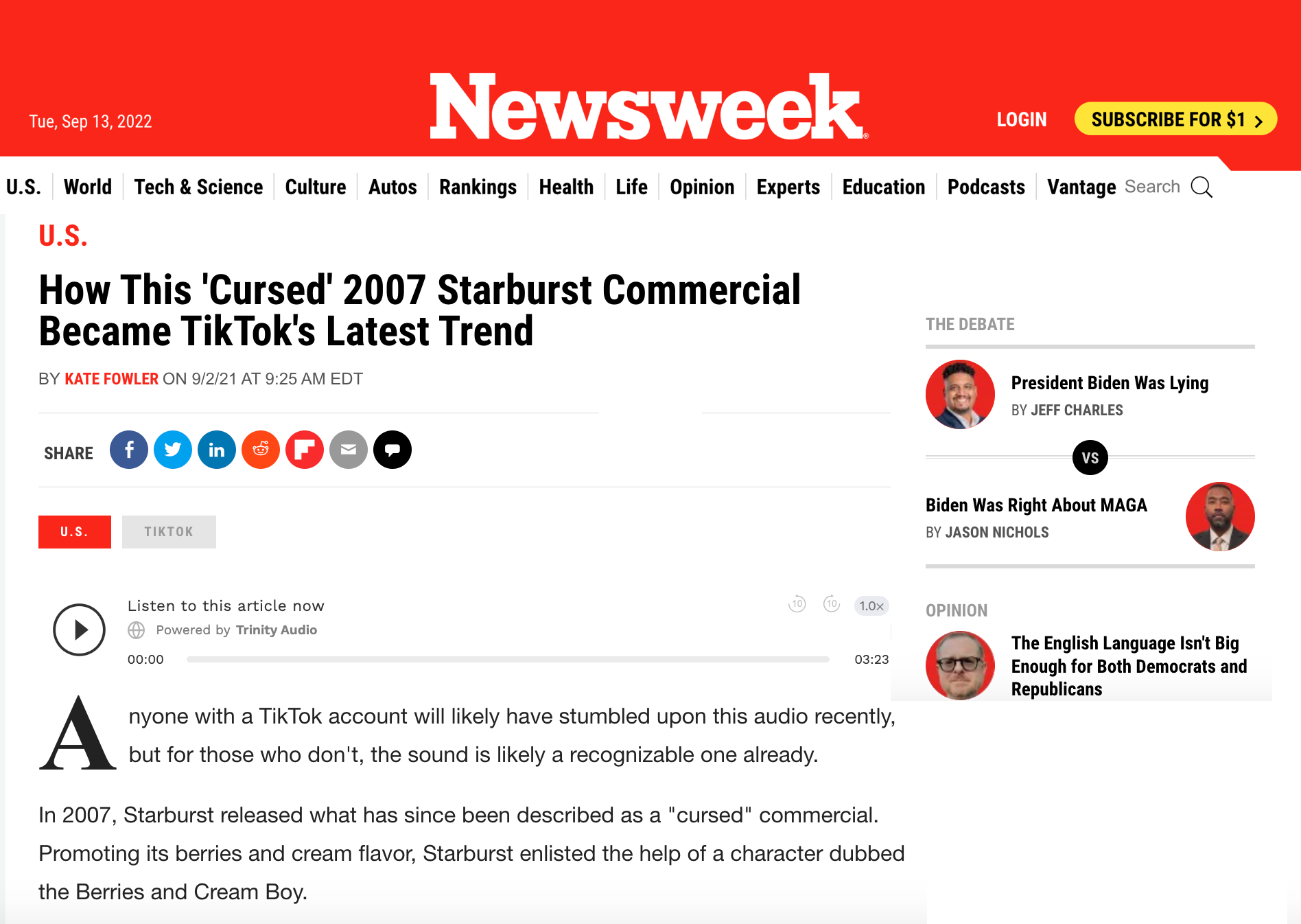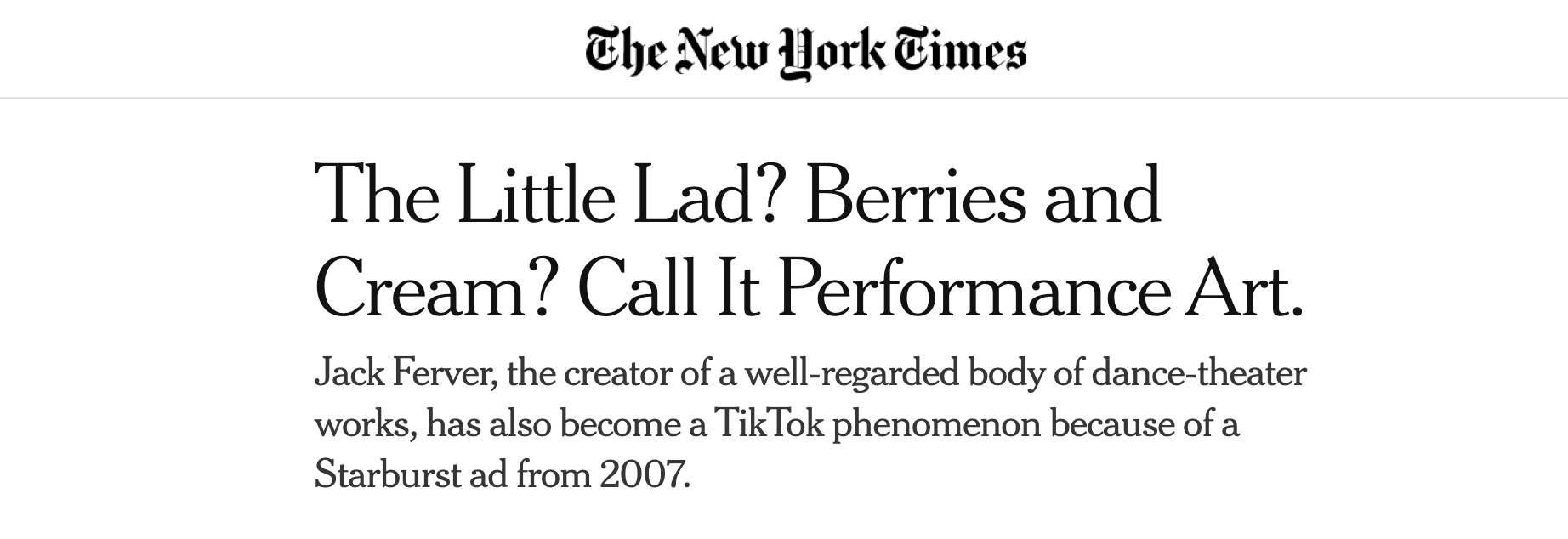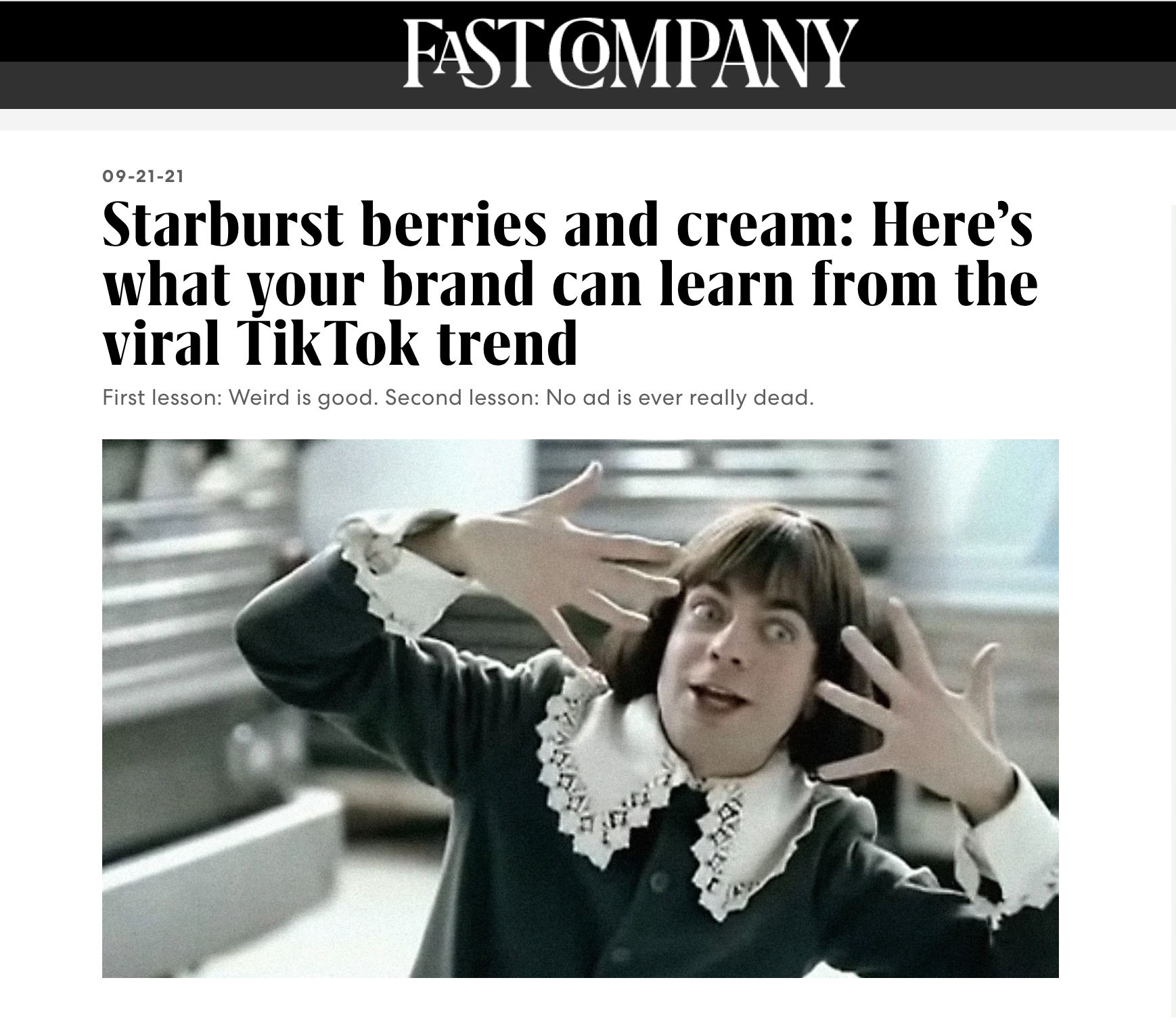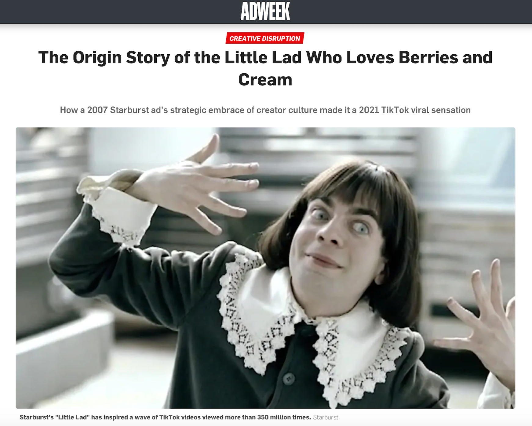 When I was a Creative Director at TBWA\Chiat\Day, I led a small group of lunatics in the creation of a commercial for a new Starburst product called "Berries and Cream." It featured a small British manchild who we called the "Little Lad." It was magically stupid and very popular at the time, but we didn't know that it was so magically stupid that fifteen years later it would have a second life on Tiktok and go on to become the most viewed content on the platform with over 4.8 billion views.